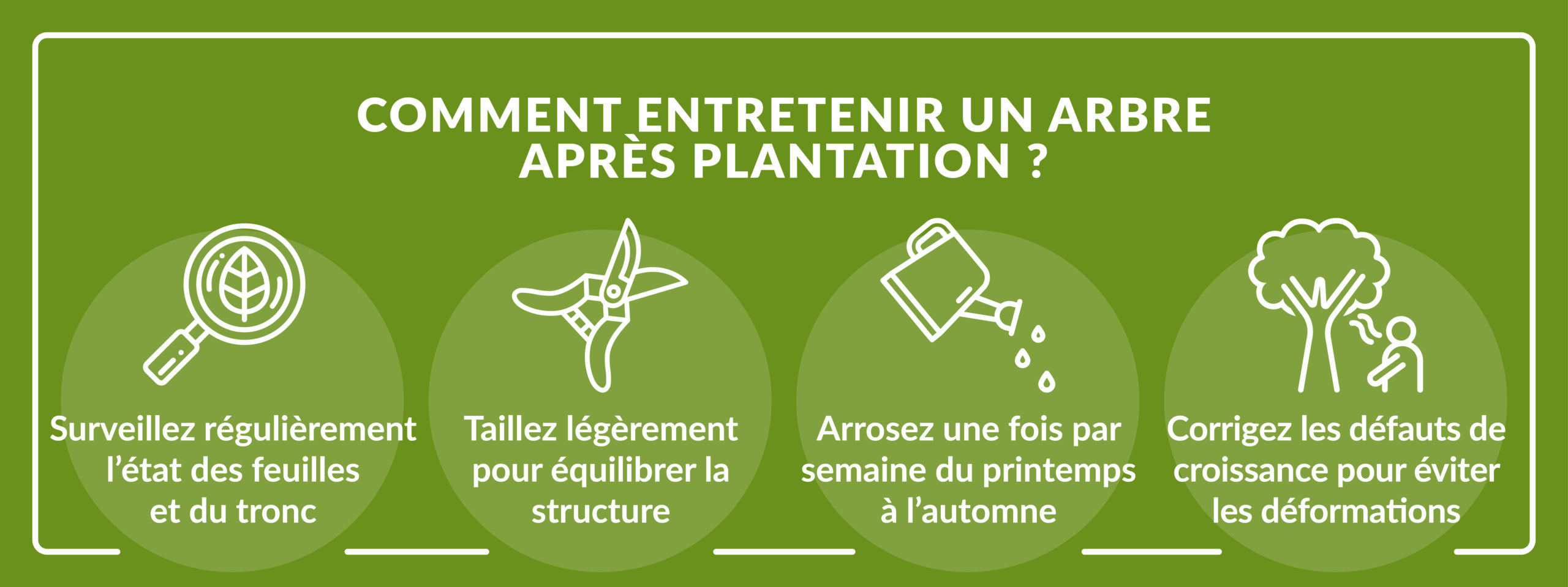 Pour garantir la bonne reprise de votre arbre, surveillez régulièrement les signes de vitalité. Une pousse régulière des feuilles, un bon état du tronc et l’absence de flétrissement indiquent que l’arbre s’adapte bien à son nouvel environnement !