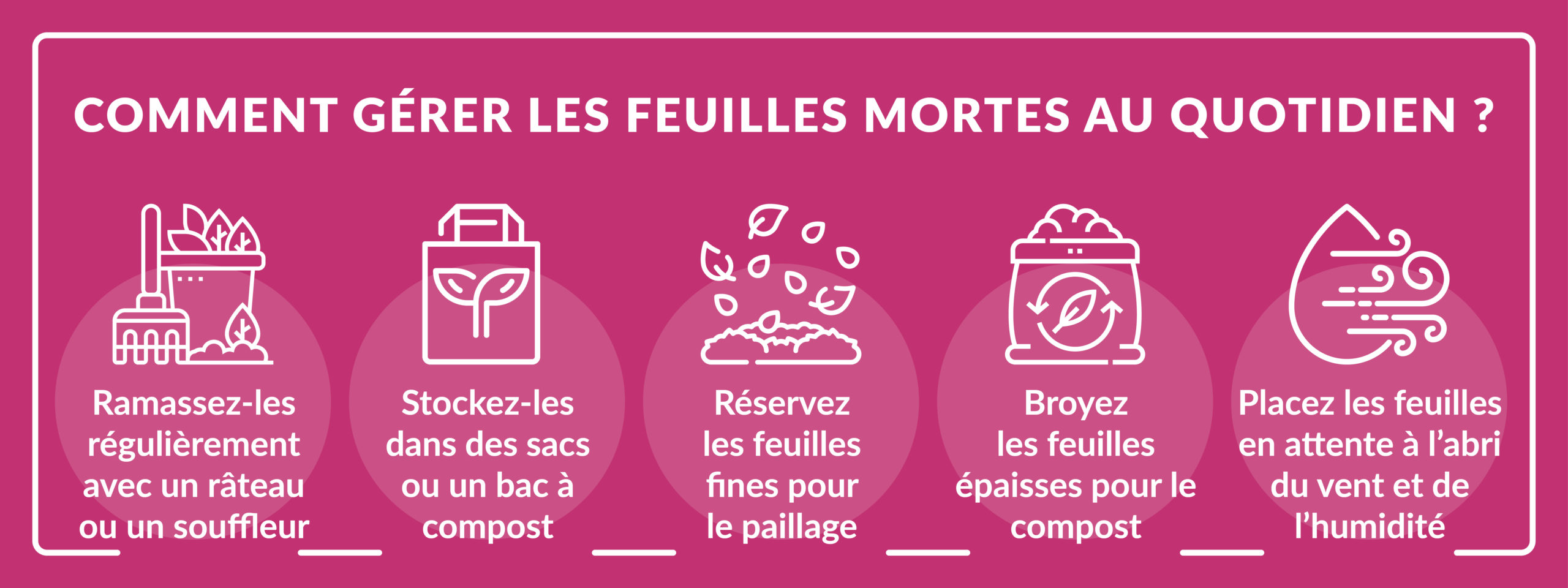 Enfin, créez un emplacement dédié pour les feuilles en attente, à l’abri du vent et de l’humidité excessive. Vous gagnez ainsi du temps et avez toujours des feuilles prêtes à enrichir votre sol ou protéger vos plantations…
